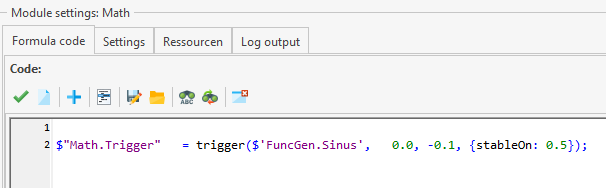 Im Math-Modul wird die Bedingung(en) geprüft und über ein Signal an das osfwriter Modul weitergeleitet. Folgendes Code-Beispiel, prüft, ob der Wert des Signals "FuncGen.Sinus" größer als 0 ist. Wenn der Grenzwert überschritten wird, wird das Trigger-Signal "Math.Trigger" auf true gesetzt.